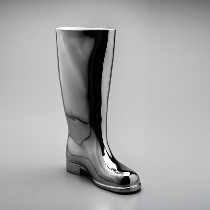 Rubber boot shaped vase, originally white, later expanded in many colour variations, starting with onion decoration and other, mainly plated variations. Part of a thesis with one of the most famous Maxima products. The author's fascination with folkiness, practical aesthetics and trivial charge is already evident here, as well as his desire to reverse a seemingly fatal fate and elevate an ordinary product through noble materials and a change of function.